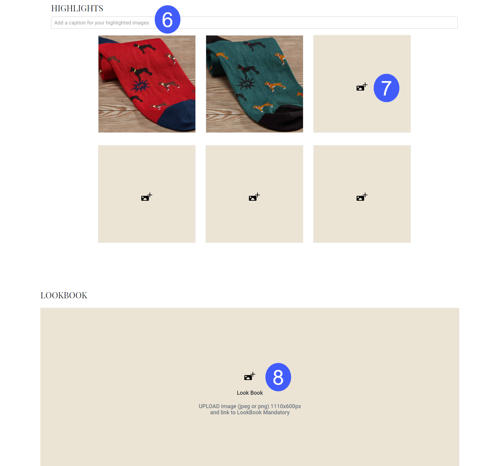 - Merchandise these six image boxes to showcase your best, most compelling products, front and center. These six images should give buyers a reason to click through to your complete Brand Showroom, so pull them in! These images can link to products within your Collection.